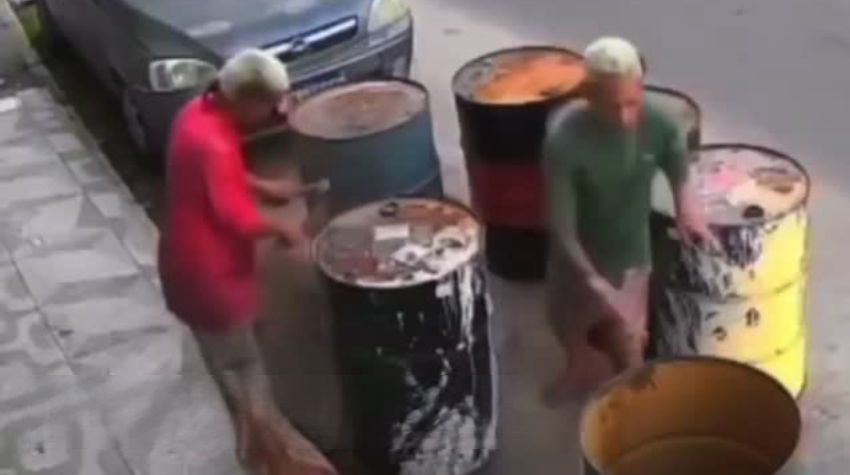 Mientras el primer hombre realizaba labores de limpieza en el interior del barril, su compañero, que vestía una camiseta roja, se acercó de manera descuidada. En un momento de negligencia, el segundo individuo decidió encender un mechero justo en la apertura del contenedor.